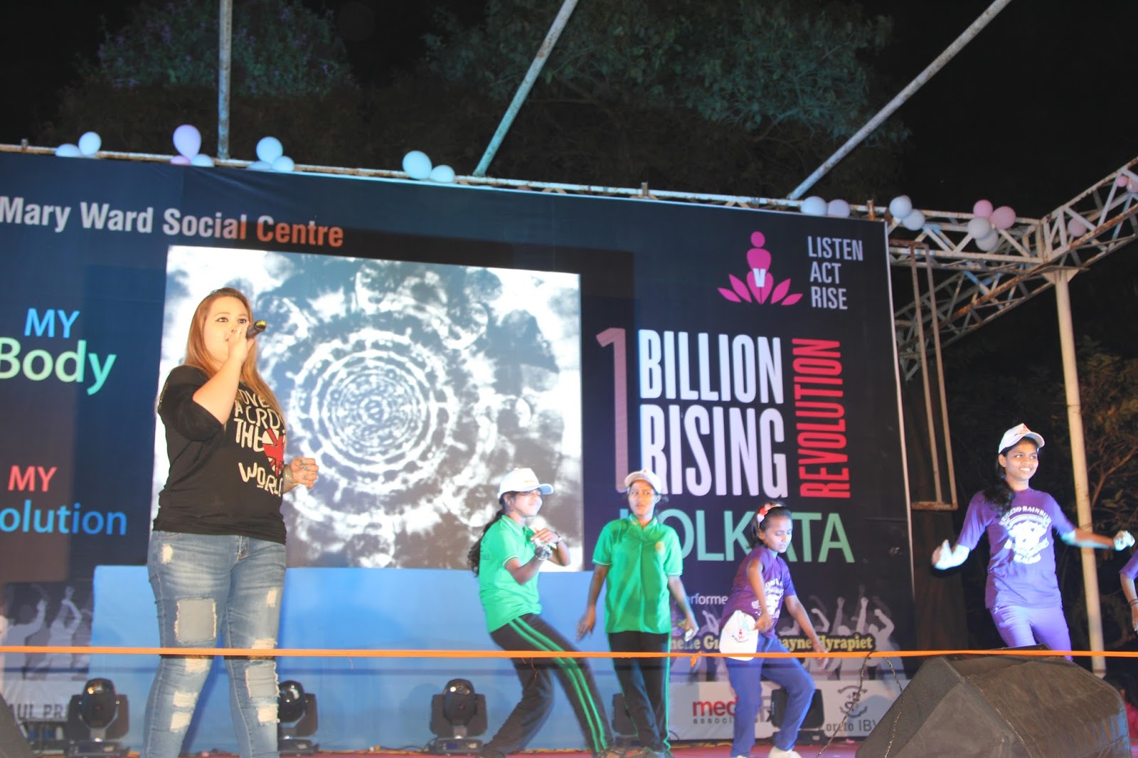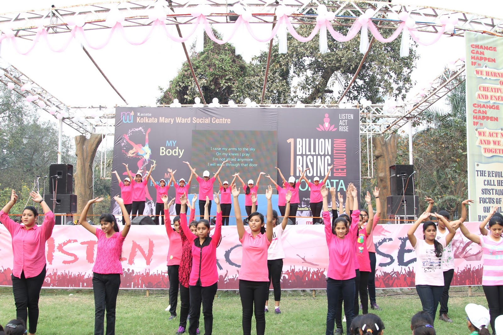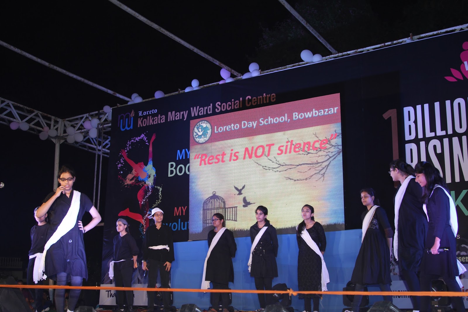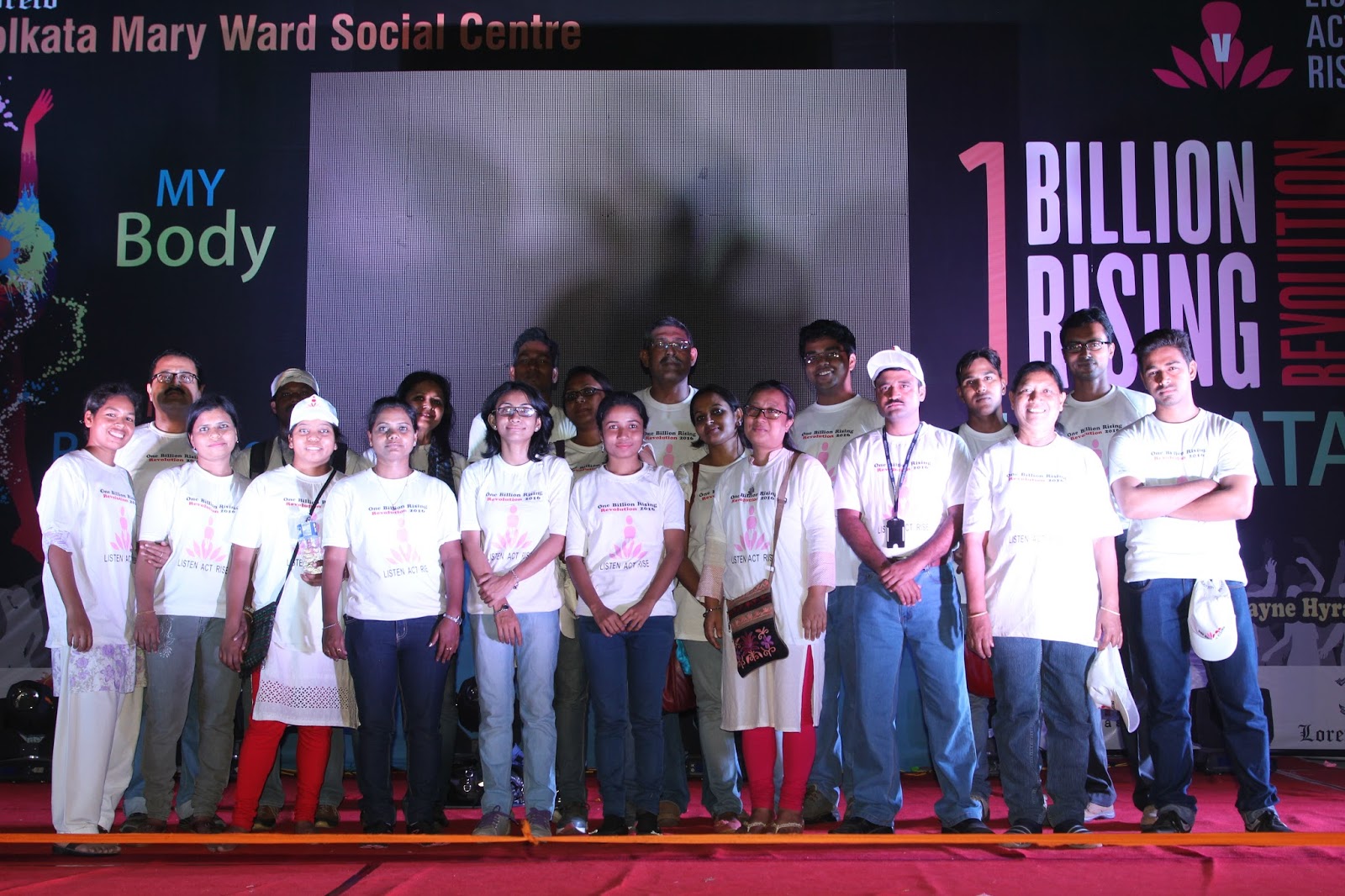The global call to Listen, Act and Rise for Justice was answered by people of Kolkata on the 13thof February 2016. Kolkata Mary Ward Social Centre (KMWSC), the flag bearers against violence and abuse of women, organized a captivating event at Mohurkunj from 4pm till 8pm. A staggering audience of 5000 including school and college students, parents, activist, NGO’s and people from all walks of life joined hands to protest against the escalating injustice in society. A flash mob flagged off the programme calling for a uprising to break the chains around women. Women ever conscious of their body revolted to live by their choice.