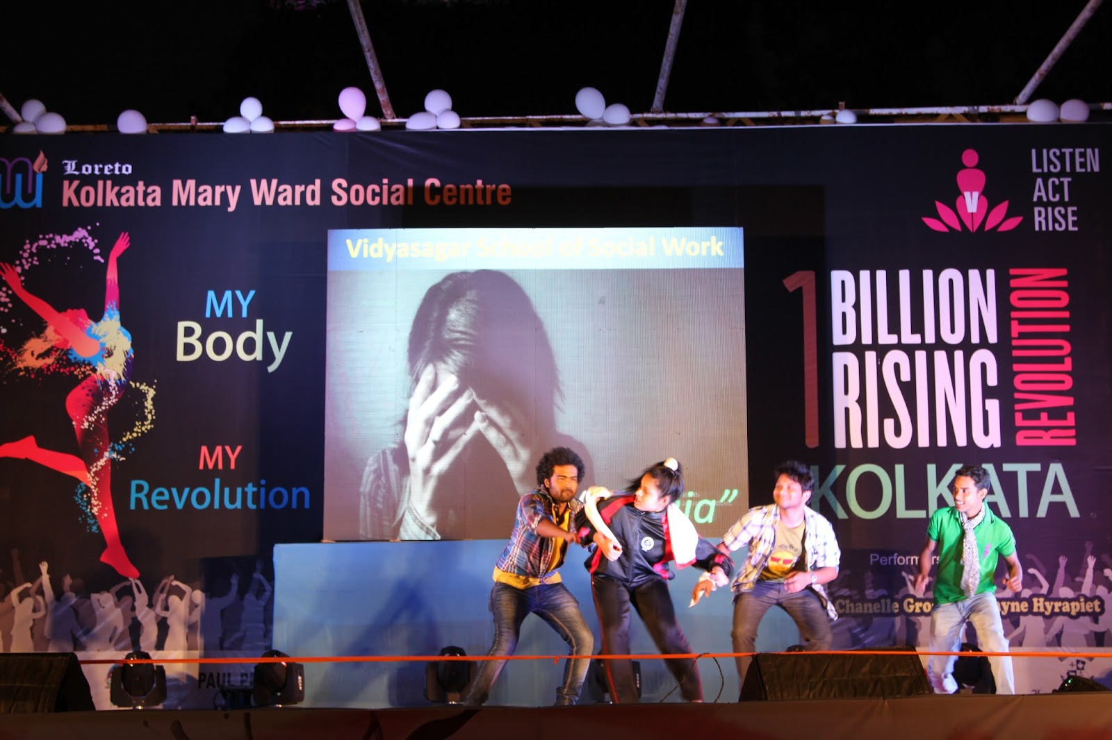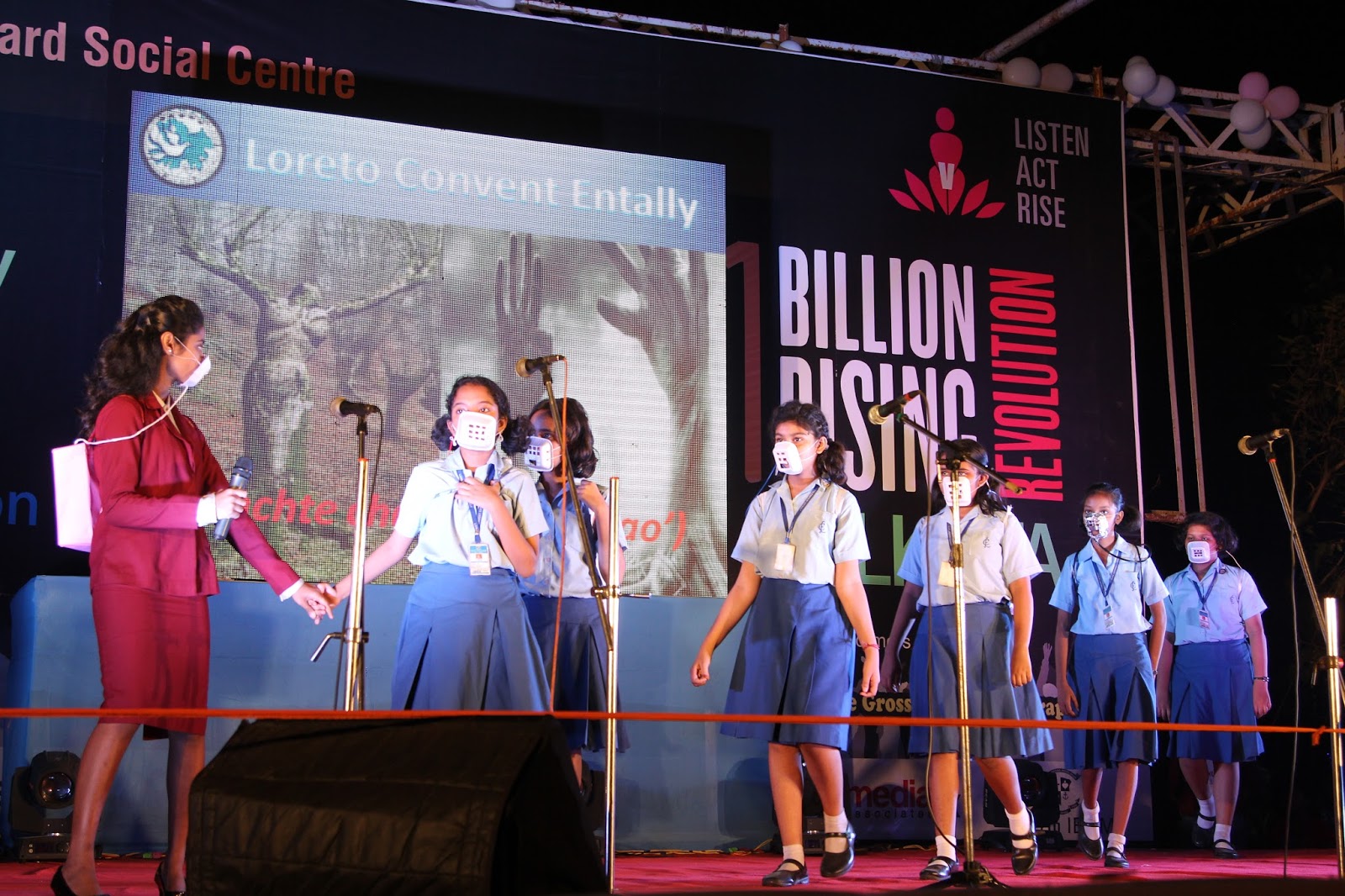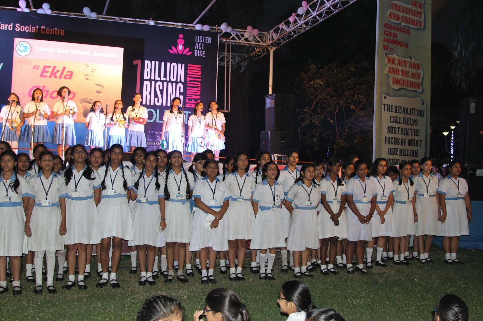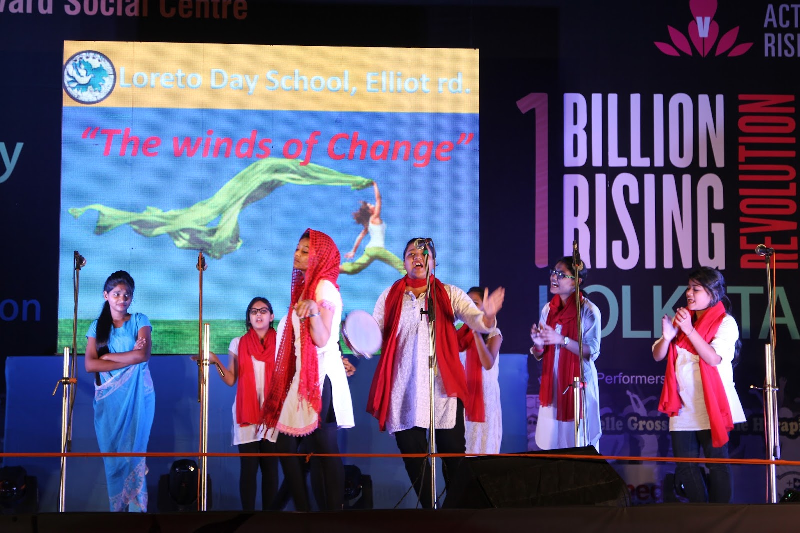 The global call to Listen, Act and Rise for Justice was answered by people of Kolkata on the 13thof February 2016. Kolkata Mary Ward Social Centre (KMWSC), the flag bearers against violence and abuse of women, organized a captivating event at Mohurkunj from 4pm till 8pm. A staggering audience of 5000 including school and college students, parents, activist, NGO’s and people from all walks of life joined hands to protest against the escalating injustice in society. A flash mob flagged off the programme calling for a uprising to break the chains around women. Women ever conscious of their body revolted to live by their choice.