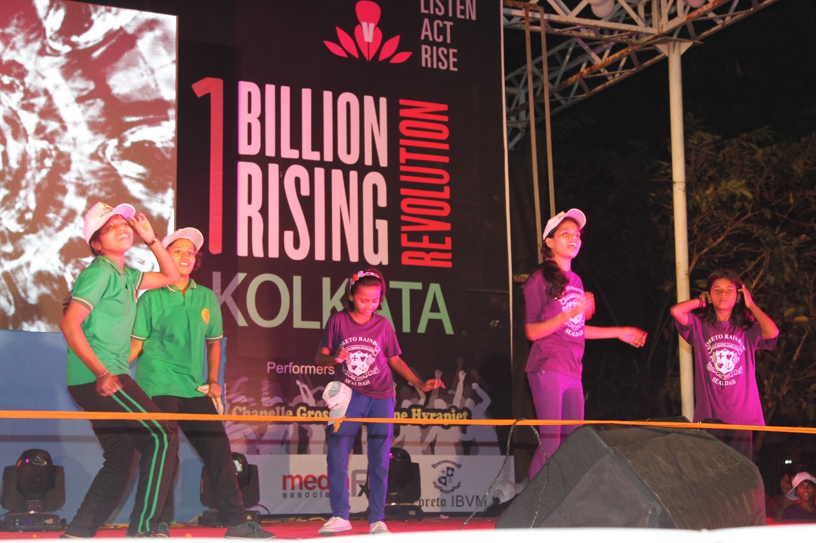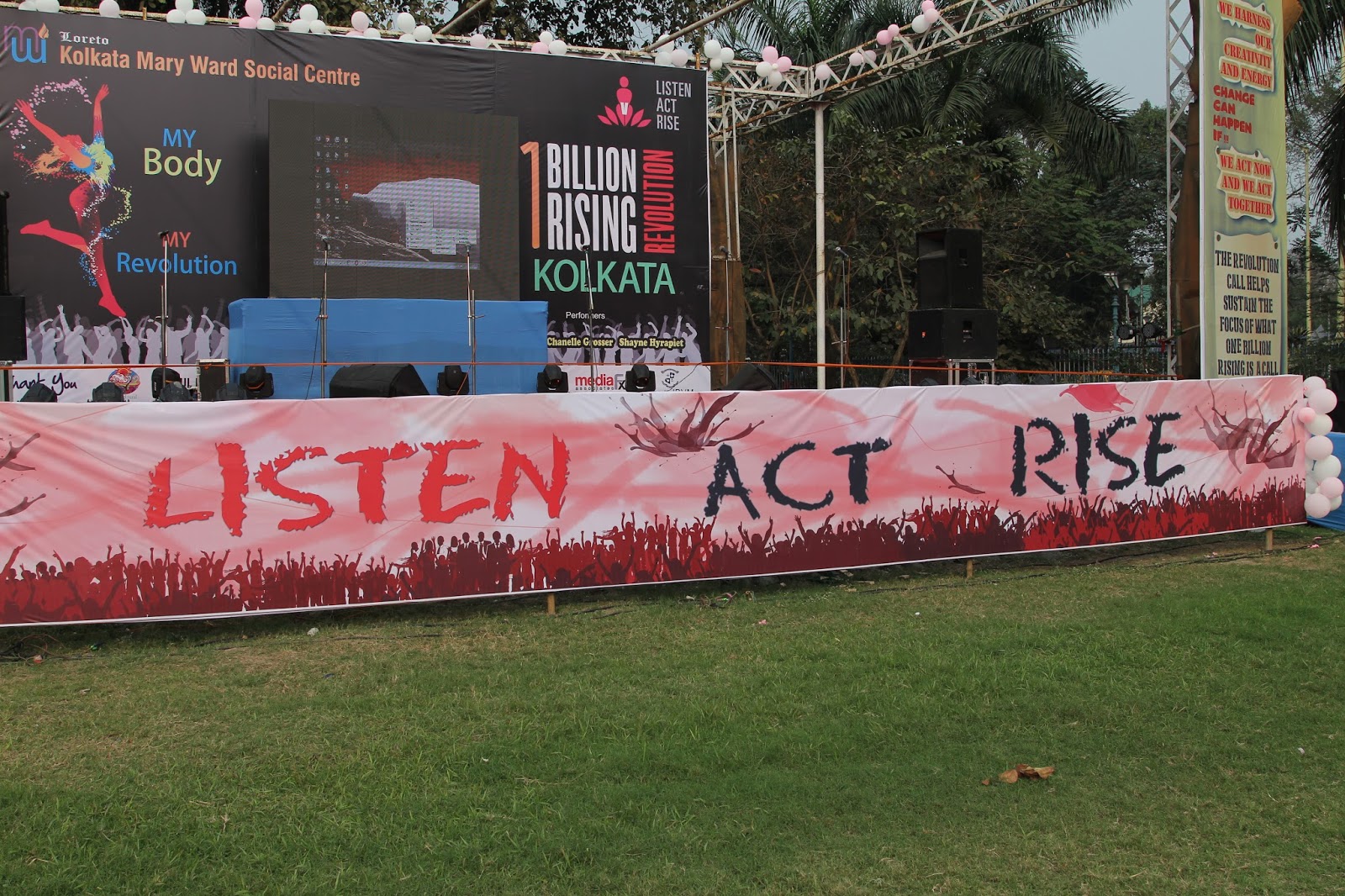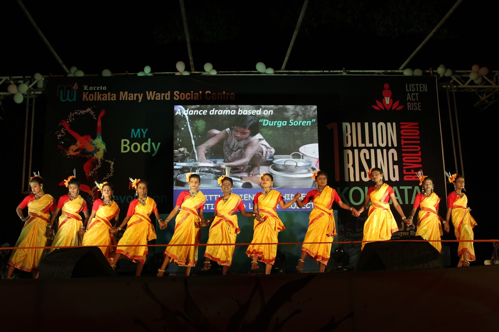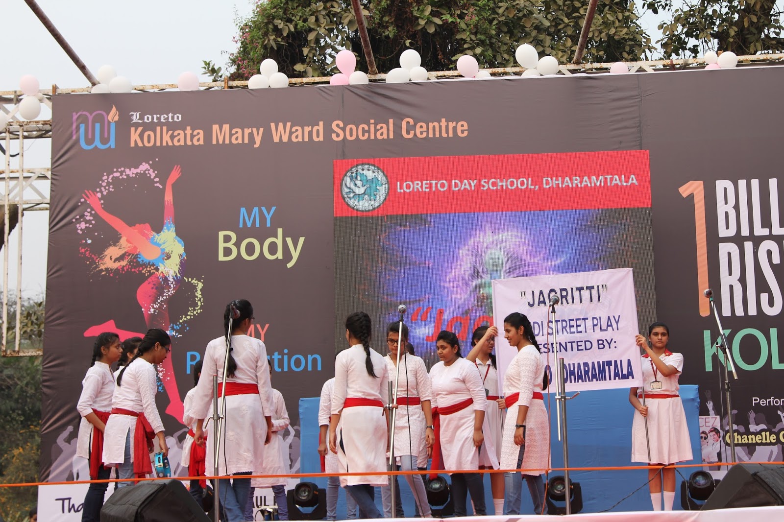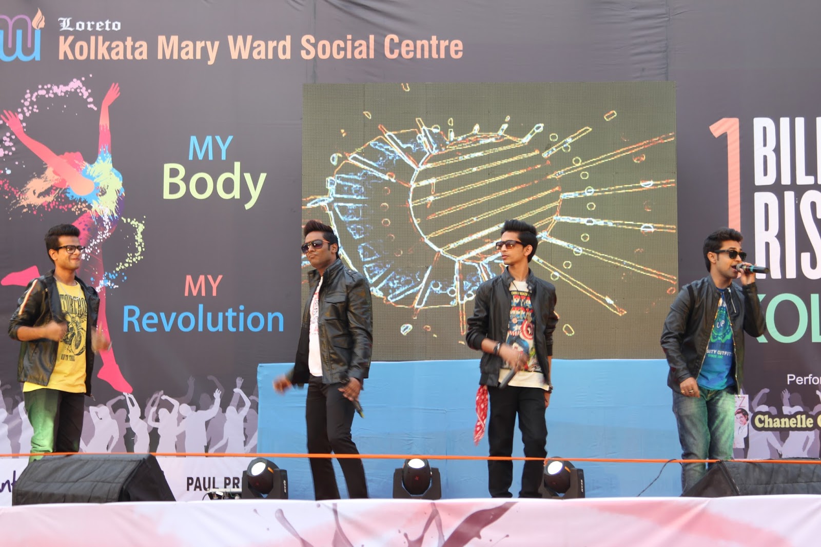 The global call to Listen, Act and Rise for Justice was answered by people of Kolkata on the 13thof February 2016. Kolkata Mary Ward Social Centre (KMWSC), the flag bearers against violence and abuse of women, organized a captivating event at Mohurkunj from 4pm till 8pm. A staggering audience of 5000 including school and college students, parents, activist, NGO’s and people from all walks of life joined hands to protest against the escalating injustice in society. A flash mob flagged off the programme calling for a uprising to break the chains around women. Women ever conscious of their body revolted to live by their choice.