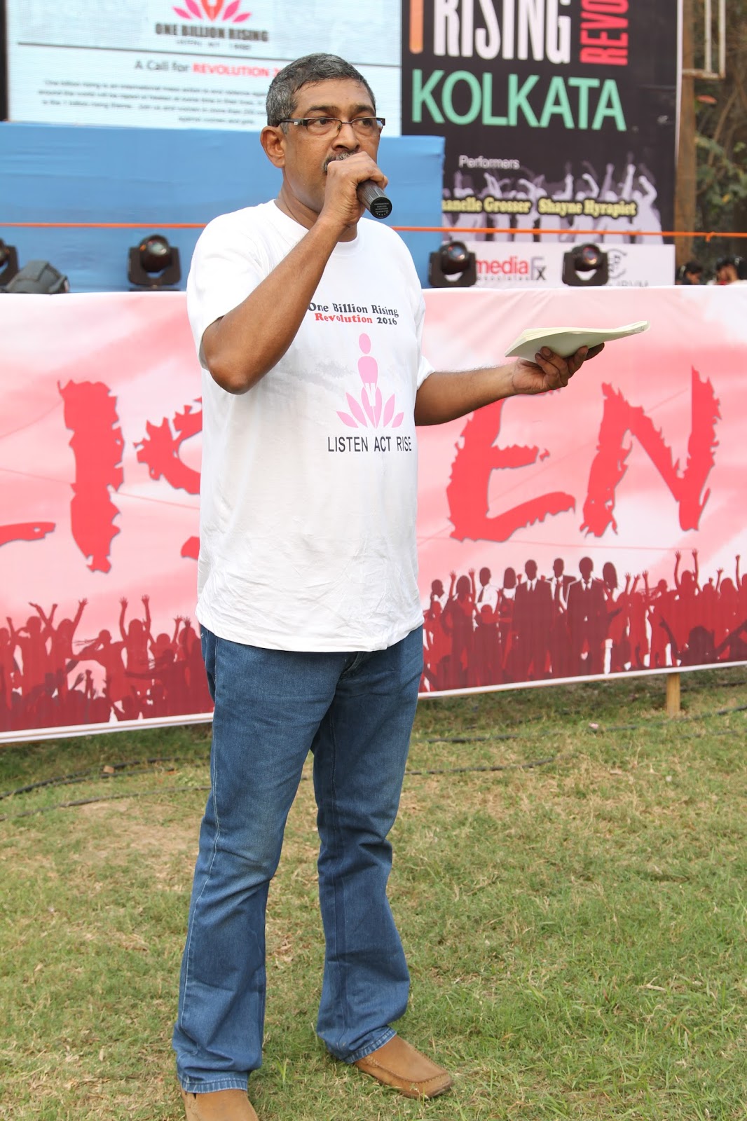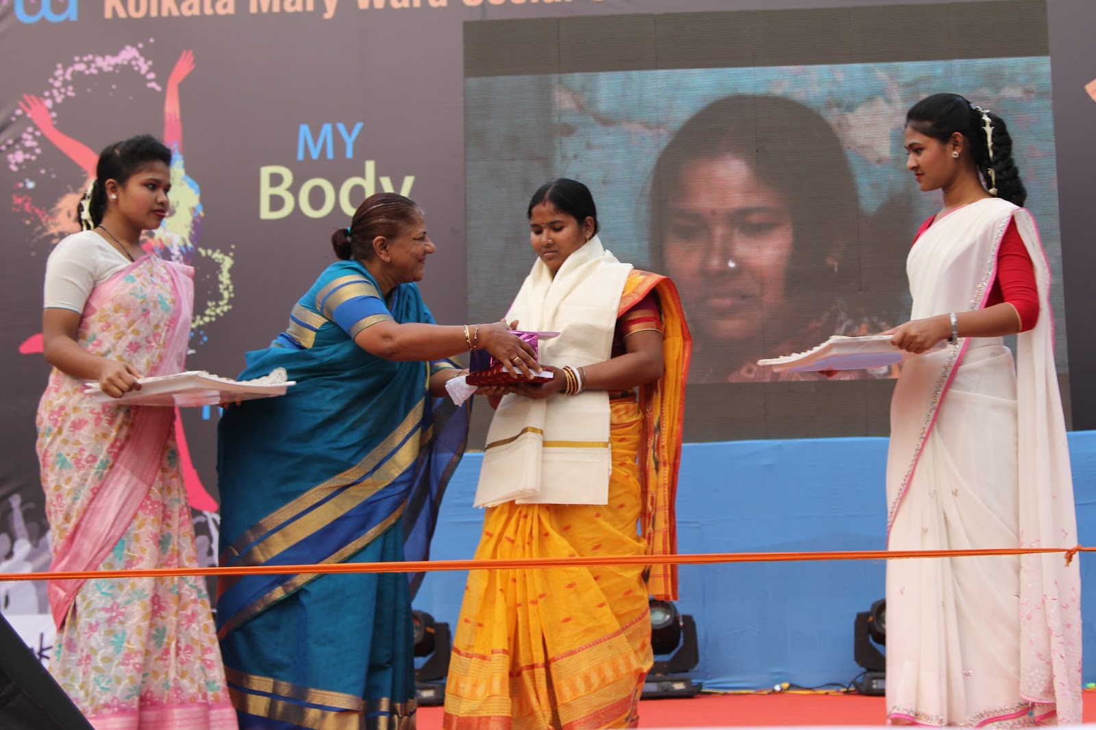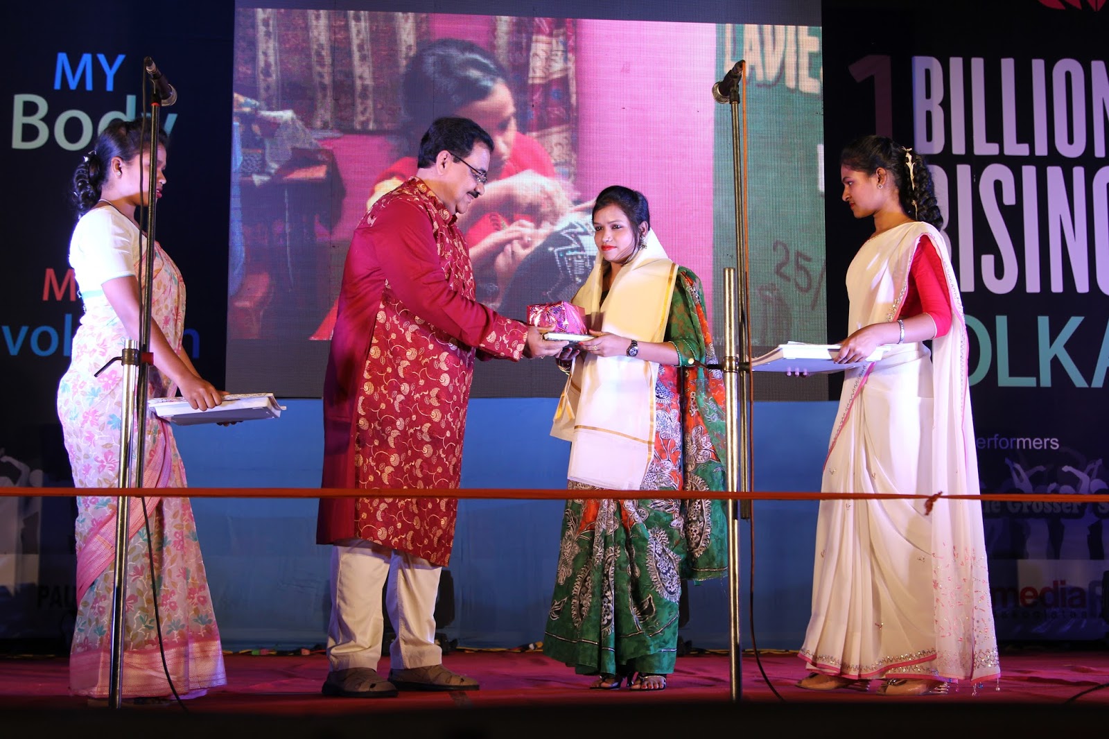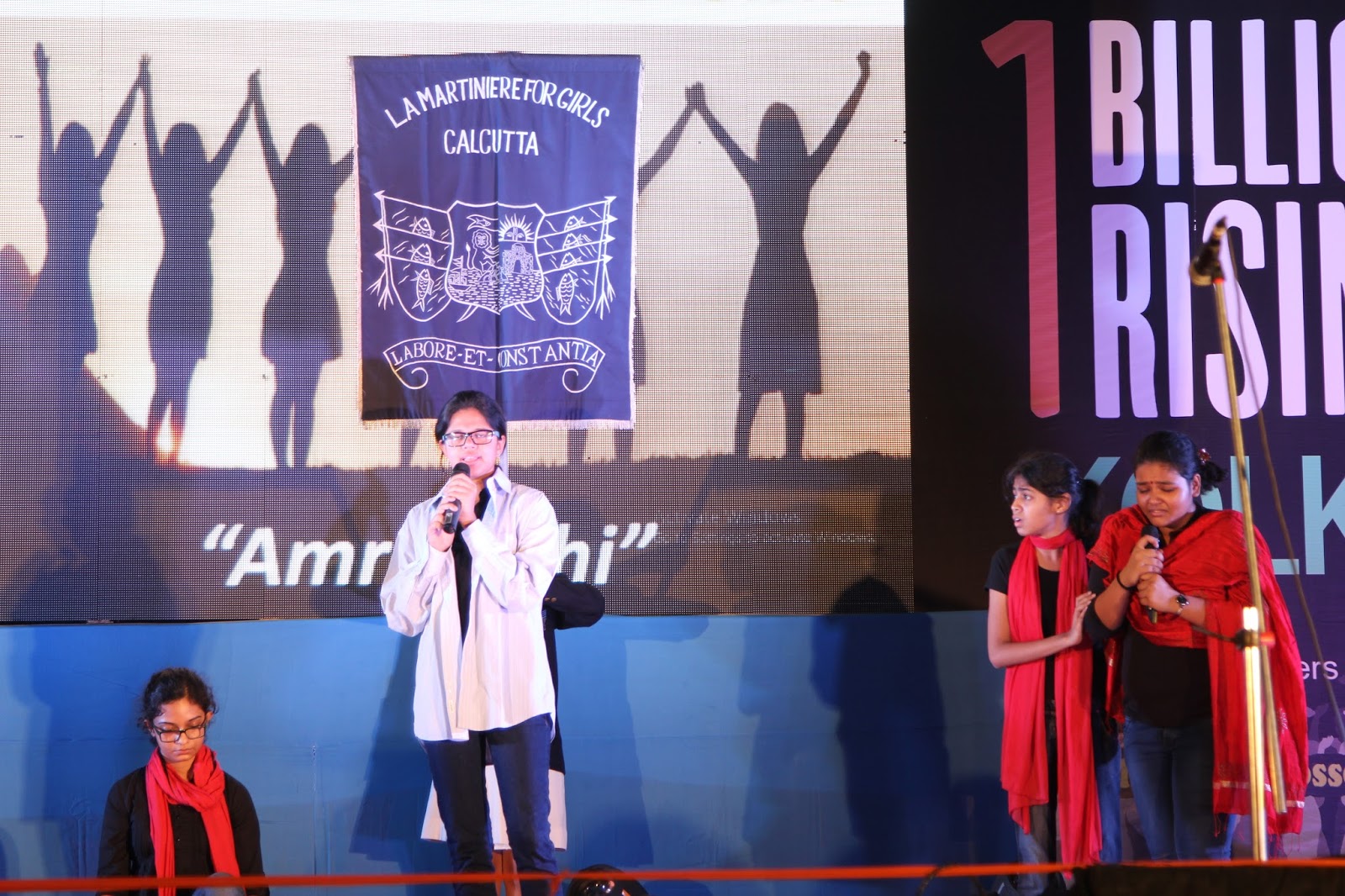 The global call to Listen, Act and Rise for Justice was answered by people of Kolkata on the 13thof February 2016. Kolkata Mary Ward Social Centre (KMWSC), the flag bearers against violence and abuse of women, organized a captivating event at Mohurkunj from 4pm till 8pm. A staggering audience of 5000 including school and college students, parents, activist, NGO’s and people from all walks of life joined hands to protest against the escalating injustice in society. A flash mob flagged off the programme calling for a uprising to break the chains around women. Women ever conscious of their body revolted to live by their choice.